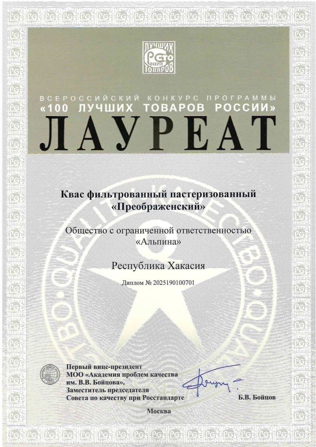 🏅 Натуральный живой квас «Преображенский» стал победителем престижного всероссийского конкурса «100 лучших товаров России 2025». Конкурс проводился под лозунгом «Стабильное качество – залог доверия потребителей»! Высокое качество продукции подтверждено официальным сертификатом и оценено представителями экспертного сообщества